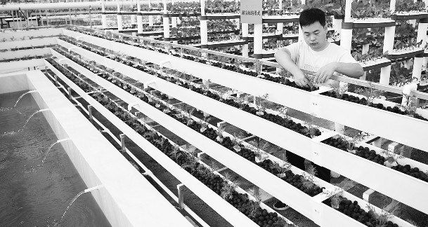 近年来,河北省河间市在推进农业供给侧结构性改革过程中,积极优化农业产业结构,依托现代农业示范园区建设,将远程数据采集、智能温控、自动滴灌等技术引入农业生产,发展培育品牌农业、智慧农业、生态旅游农业等特色高效农业,辐射带动农业增效和农民增收,助力乡村振兴。图为河间市一家现代农业示范园区的工作人员在智能温室内管理鱼菜共生模式栽培的蔬菜。