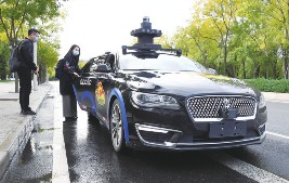 近日,百度公司宣布向北京公众开放自动驾驶出租车服务,市民可通过百度地图及Apollo GO App一键呼叫,免费搭乘体验百度自动驾驶出租车。图为市民在北京市海淀区稻香湖路的百度自动驾驶出租车指定上车点乘车。