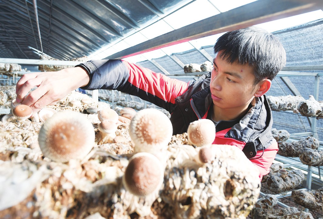 近年来,甘肃省临夏回族自治州东乡族自治县在易地扶贫搬迁安置点加大产业支持力度,依托当地农牧业资源,按照“企业+合作社+农户”的模式,因地制宜,壮大食用菌培育、蔬菜种植等产业,促进搬迁群众稳定增收。图为工人在东乡族自治县那勒寺易地扶贫搬迁安置点后续产业园温棚里采摘香菇。(史有东)