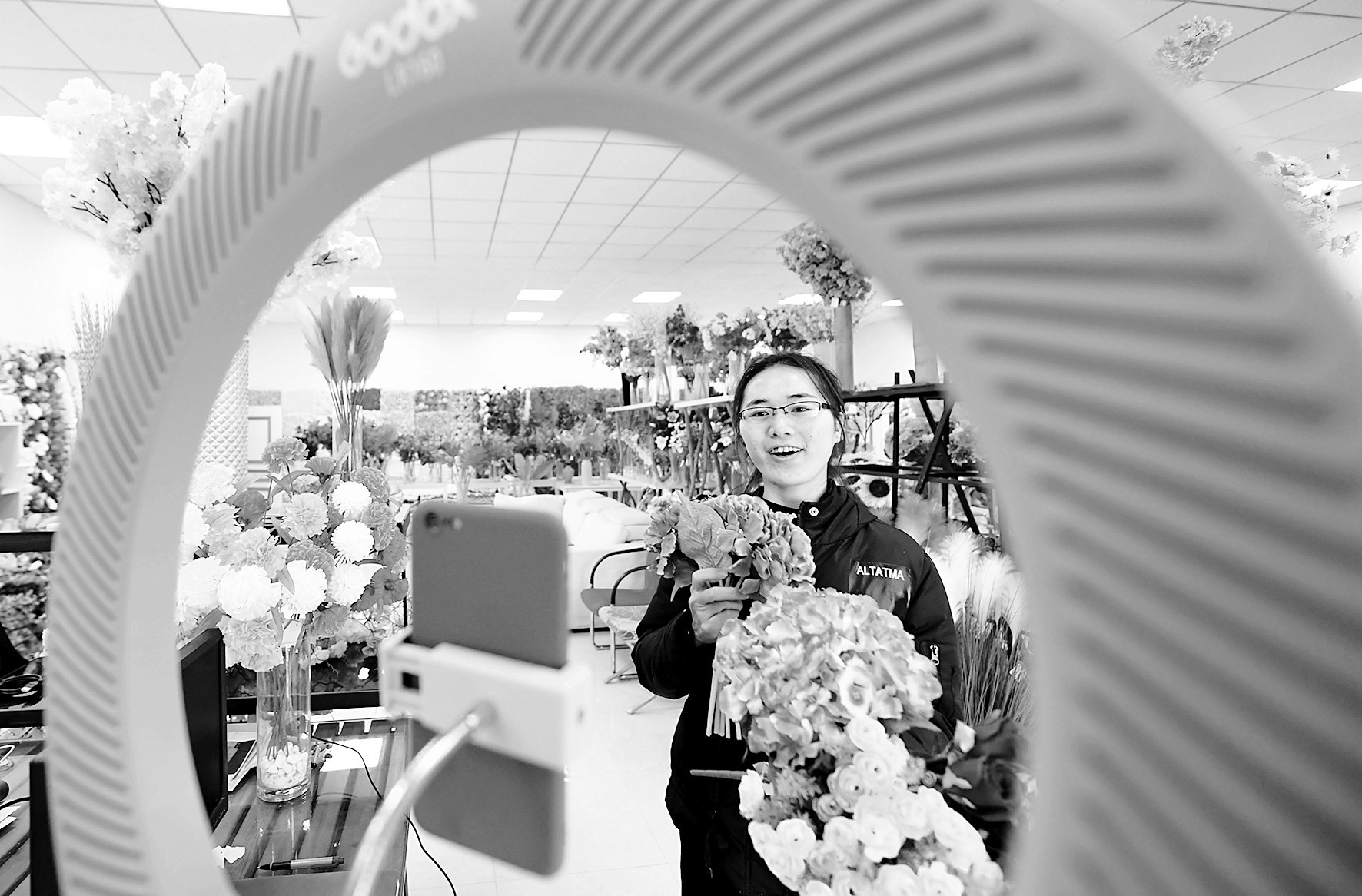 近年来,河北省廊坊市安次区在推进精准扶贫过程中,鼓励当地劳动密集型、手工加工型企业在乡村建立“扶贫微工厂”,帮助村民在家门口就业。该区“扶贫微工厂”涉及玩具、手工艺品等多个行业,带动了千余名村民就业。图为村民在廊坊市安次区仇庄乡大王务村一家“扶贫微工厂”进行线上直播销售仿真花。