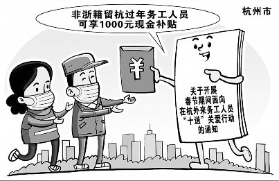 杭州市日前出台《关于开展春节期间面向在杭外来务工人员“十送”关爱行动的通知》,其中明确,非浙江户籍留杭过年务工人员符合条件的可获得1000元的现金补贴。