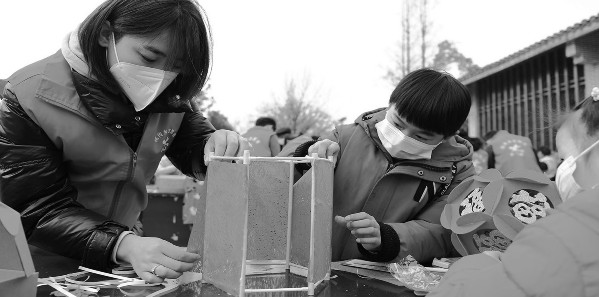 (图)①安徽省合肥市肥西县铭传乡留守儿童和志愿者一起制作灯笼。刘军喜/摄