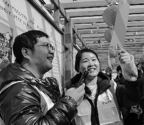 ②江苏省无锡市外来务工人员在项目工地体验猜灯谜游戏。李博/摄