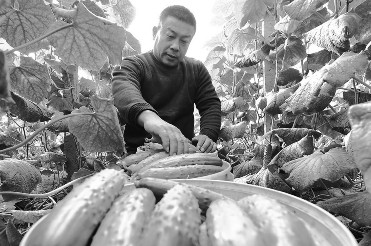 ⑤河北省唐山市乐亭县一家蔬菜生产合作社的员工在大棚内采摘黄瓜。新华社发