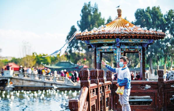 近日,云南省昆明市大观公园里牡丹、郁金香盛开,不少游客到公园赏花、划船、喂红嘴鸥,欢度新春佳节。图为游客在大观公园里喂红嘴鸥。