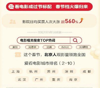 支付宝数据显示,随着《唐人街探案3》《你好,李焕英》《刺杀小说家》等上映,支付宝上日均买票观影人次上涨超560%。奔着观影品质的大众越来越多,贾玲、刘德华、沈腾“新铁三角”成为支付宝上搜索最热的电影人,与此同时,3D眼镜、IMAX搜索涨幅也都超过650%。