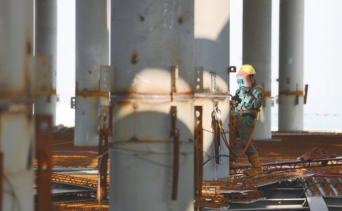 新春伊始,海口国际免税城项目建设现场一派繁忙。目前该项目的免税商业综合体已完成地上钢结构主体框架封顶,建成后将成为海口新地标,国际旅游消费中心的新名片。图为2月20日,工人在海口国际免税城项目工地施工。