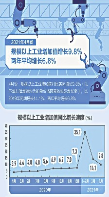 生产稳中有升,需求继续扩大。从生产看,4月份,全国规模以上工业增加值两年平均同比增长6.8%,比上月加快0.6个百分点;服务业生产指数两年平均同比增长6.2%,整体上保持稳定增长态势。从需求看,4月份,社会消费品零售总额两年平均同比增长4.3%,继续保持稳定增长态势。