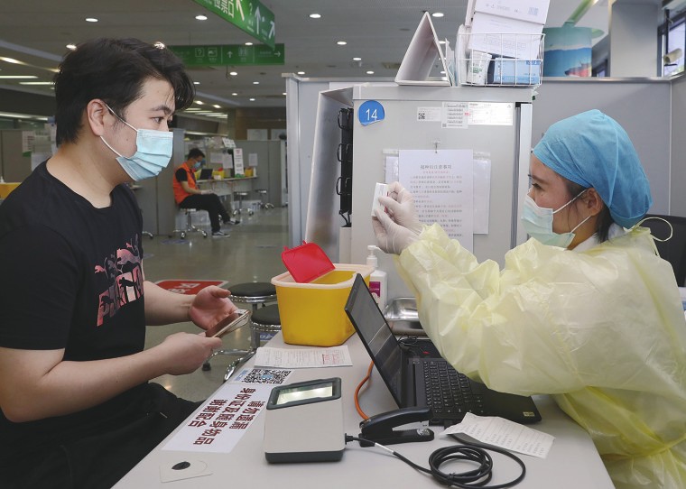 近日,全程只需一针的新冠疫苗在上海多个区的接种点陆续开打。据上海市疾病预防控制中心介绍,不同种类的疫苗由于研发技术路线和生产工艺不同,所需接种剂次也就不同。与之前上海使用的三种新冠病毒灭活疫苗相比,康希诺公司生产的重组新冠病毒疫苗(5型腺病毒载体)采用的生产技术完全不同。这两类疫苗的接种方式和接种年龄范围相同。从临床试验研究的结果和紧急使用的研究结果、上市后监测的结果来看,包括腺病毒载体疫苗和灭活疫苗在内的已经附条件获批上市的新冠疫苗,均具有良好的安全性。图为5月18日,在上海市徐汇区凯旋南路接种点,护士在注射前向市民展示腺病毒载体疫苗信息。