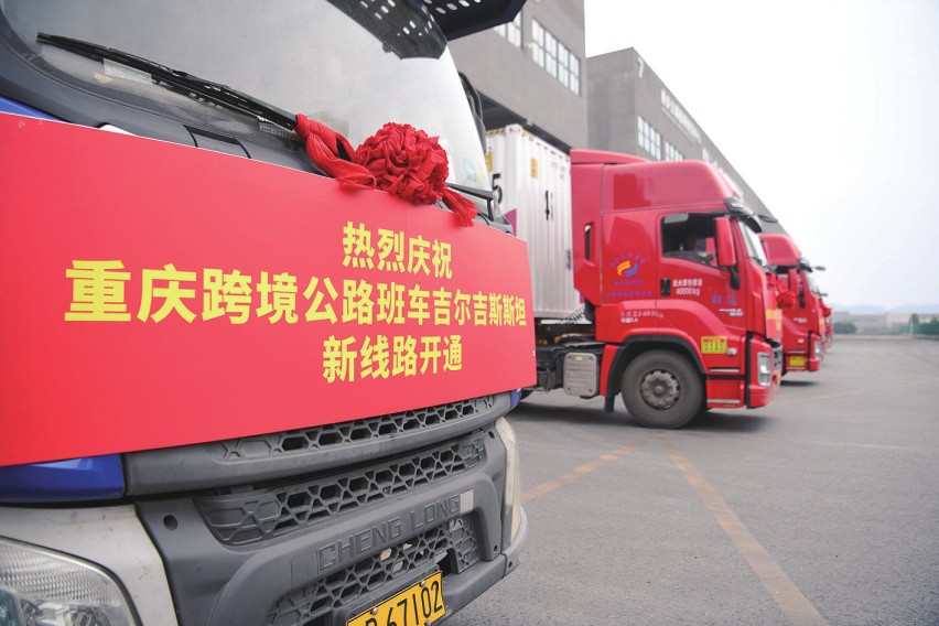21日,一队跨境公路班车从重庆南彭公路保税物流中心发车。车队将经新疆霍尔果斯口岸出境,前往吉尔吉斯斯坦首都比什凯克,全程约5400公里,用时约12天。该班车的开行,标志着重庆跨境公路班车又一国际陆运通道实现互联互通。图为在重庆南彭公路保税物流中心,重庆至吉尔吉斯斯坦跨境公路首发班车等待发车。
