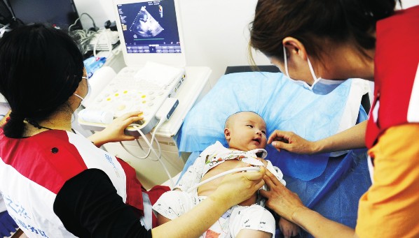日前,“天使之旅——先心病患儿筛查救助行动”走进新疆,由中国红十字基金会和郑州市心血管病医院组成的志愿团队在新疆哈密、吐鲁番、昌吉及阿勒泰等地开展公益筛查行动,符合手术指征的患儿将接受免费手术治疗。图为在新疆昌吉州红十字会,来自郑州市心血管病医院的医生在为孩子做检查。