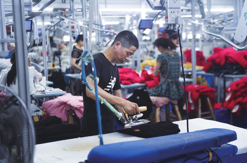 浙江省湖州市吴兴区织里镇享有“中国童装之都”的美誉,拥有从童装设计、加工、销售,到面辅料供应、物流仓储等的产业链。织里镇全镇目前拥有童装企业1.4万家,电商企业8000多家。图为在位于织里镇的湖州朗田服饰有限公司内,工作人员在流水线上熨烫童装。