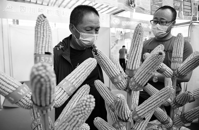 7月27日,第八届宁夏种业博览会在宁夏回族自治区石嘴山市平罗县种子小镇泰金种业产业园开幕。图为参会者在展览现场了解种子产品。