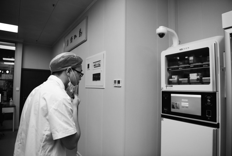 近日,湖南省长沙市第一医院门诊智慧药房正式投入使用。据介绍,智慧药房引进药品自动存储发放管理系统,药方经药师审核后,系统开始自动配药,药品由机械臂取出,并通过传输通道送到取药窗口,提高了药品配发的效率与准确率,缩短了患者取药等候时间。图为8月11日,长沙市第一医院的医务人员在门诊智慧药房通过人脸识别从麻醉药品智能化管理系统中取药。