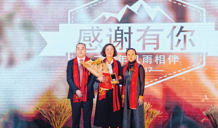 (图3)2018年,青海天桥二十周年庆典现场,郑永建(左)为员工颁奖