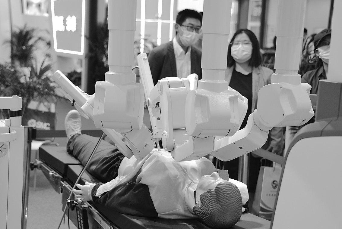 9月10日至13日,以“共享新成果、共注新动能”为主题的2021世界机器人大会在北京举行。110余家企业和科研机构携500多款产品参展,集中展示在服务、工业、特种机器人等不同应用领域的最新产品。图为机器人大会上展示的一款智能手术机器人。
