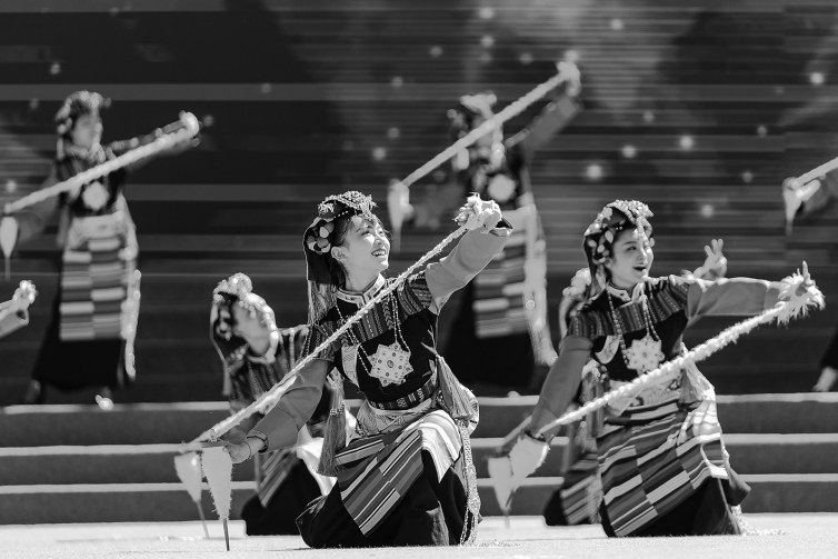 9月13日,2021雅砻文化旅游节在西藏自治区山南市开幕。今年的雅砻文化旅游节以“建设美丽新山南,圆梦幸福新时代”为主题,旨在进一步促进各民族交往交流交融,吸引更多人走进山南、了解山南。图为演员在2021雅砻文化旅游节开幕式上表演舞蹈《织梦》。
