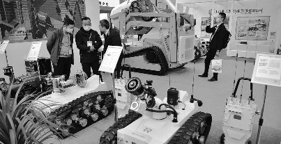 13日,第十六届榆林国际煤炭暨高端能源化工产业博览会在陕西省榆林市开幕。本届展会总展示面积5万平方米,分设智慧数字、智能制造、低碳发展、绿色矿山等6个展区。图为观众在展会上了解多款矿用机器人。邵瑞/摄