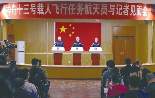 10月14日,执行神舟十三号载人飞行任务的3名乘组航天员翟志刚(中)、王亚平(右)、叶光富在酒泉卫星发射中心问天阁与中外媒体记者集体见面,并回答记者提问。