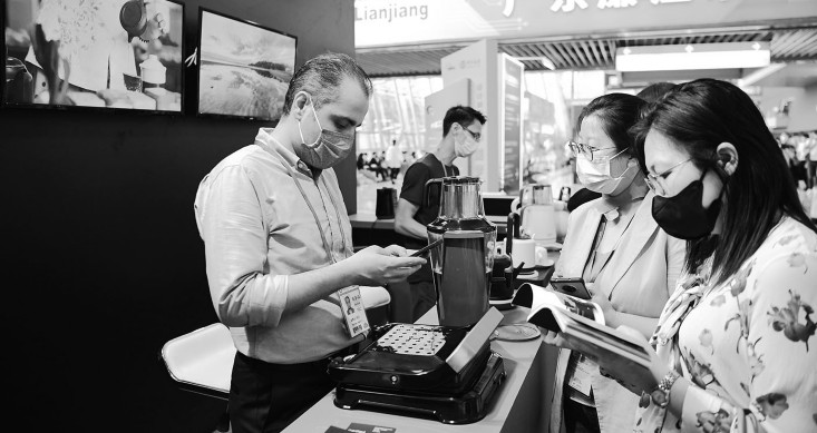 本届广交会采取线上线下融合办展的新模式。线下展览面积达40万平方米,以品牌企业、民营企业为主体,参展企业共7795家;线上约2.6万家企业参展,上传展品超过282万件,创历史新高。图为一名企业代表(左)在广交会现场与客户洽谈。