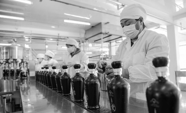 深秋时节,河北省丰宁满族自治县的白酒企业进入酿酒繁忙期,当地企业员工按照非遗酿造技艺生产白酒,浓郁的酒香在厂区飘荡。图为在丰宁县一家酿酒企业,工人在包装车间忙碌。
