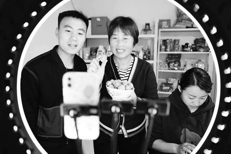 近年来,河北省邢台市内丘县积极组织本土电商人才通过电商平台和直播带货方式,拓宽销售渠道,向消费者推介当地农产品,带动农民增收致富。图为在河北省内丘县柳林镇王家庄村,主播通过网络直播销售核桃。刘继东/摄