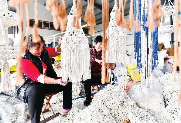 作为我国重要的绳网生产基地,山东省惠民县利用电子商务、大数据和物联网等技术,推动“互联网+绳网产业”“双网融合”发展,形成了集原材料供应、研发设计、成品加工、市场销售、应用服务等于一体的集群体系。图为在惠民县李庄镇一家绳网企业,村民加工绳网制品。
