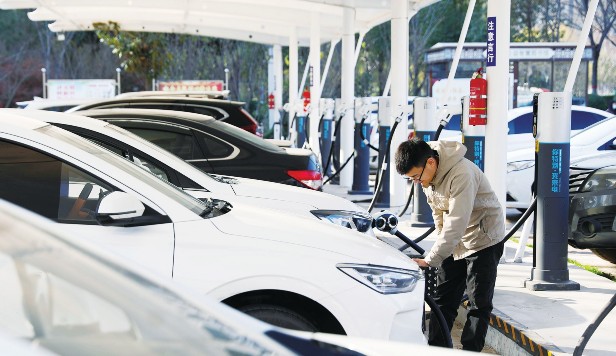 近日,一座拥有14台充电桩的新能源车充电站在河南省平顶山市宝丰县龙兴湖公园投入运行,居民可通过手机扫码,使用充电桩为新能源车充电。近年来,宝丰县加大了新能源汽车充电设施的建设力度,助力居民绿色出行。图为在宝丰县龙兴湖公园,市民使用充电桩为新能源车充电。