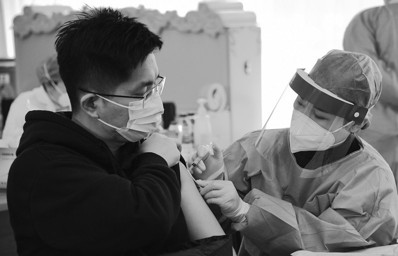 7日,北京市海淀区上地街道组织医护人员来到海国瑞业科技园,为园区内的企业员工进行新冠疫苗加强针接种,在方便企业员工接种的同时,巩固免疫屏障。图为在海国瑞业科技园的一家企业,医护人员为企业员工接种新冠疫苗加强针。