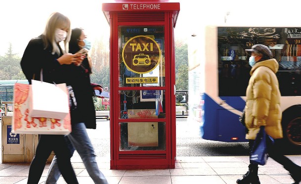 14日,上海街头部分公用电话亭内设置了“一键叫车智慧屏”,人们可通过点击“一键叫车”来呼叫出租车。此外,电话亭还有无线上网、手机充电等功能,为人们出行提供便利。图为行人从上海市人民广场附近具备“一键叫车”功能的电话亭旁经过。