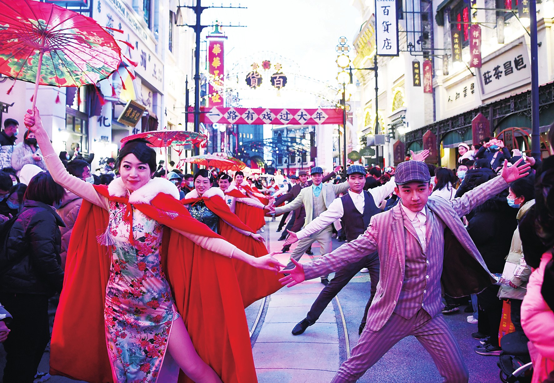 春节长假期间,不少游客来到河南郑州建业·华谊兄弟电影小镇,赏花灯、看演出,欢度佳节。图为演员在电影小镇表演节目。
