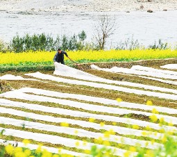 早春时节,气温回升,各地农民不误农时,积极开展春耕备耕生产工作。图为贵州省榕江县忠诚镇乐乡村的农民在田间铺设地膜,准备种植西瓜。(杨文斌)