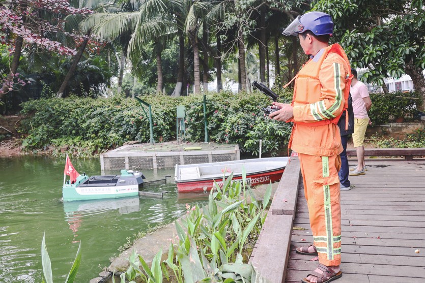 今年1月,一艘无人驾驶清洁船在海口东湖投入使用。该船运载量约50公斤,可清理湖面上的树叶、水草、塑料水瓶等垃圾。图为3日环卫工人操控无人驾驶清洁船在海口东湖清理湖面。张丽芸/摄