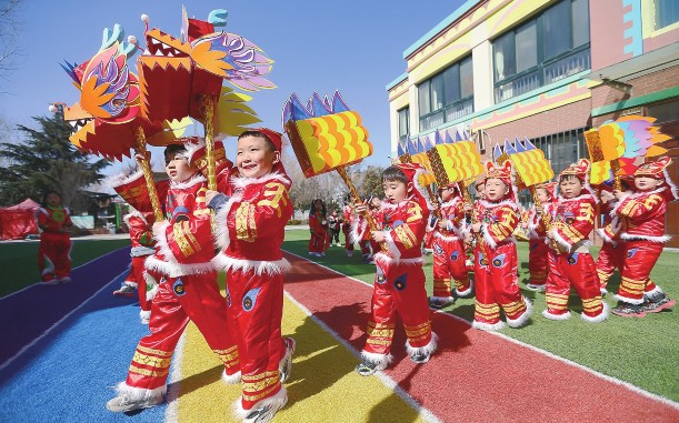农历二月初二到来之际,各地举办丰富多彩的民俗活动迎接“二月二”。图为3日山东省青岛市即墨区龙山中心幼儿园的孩子们在进行舞龙表演。