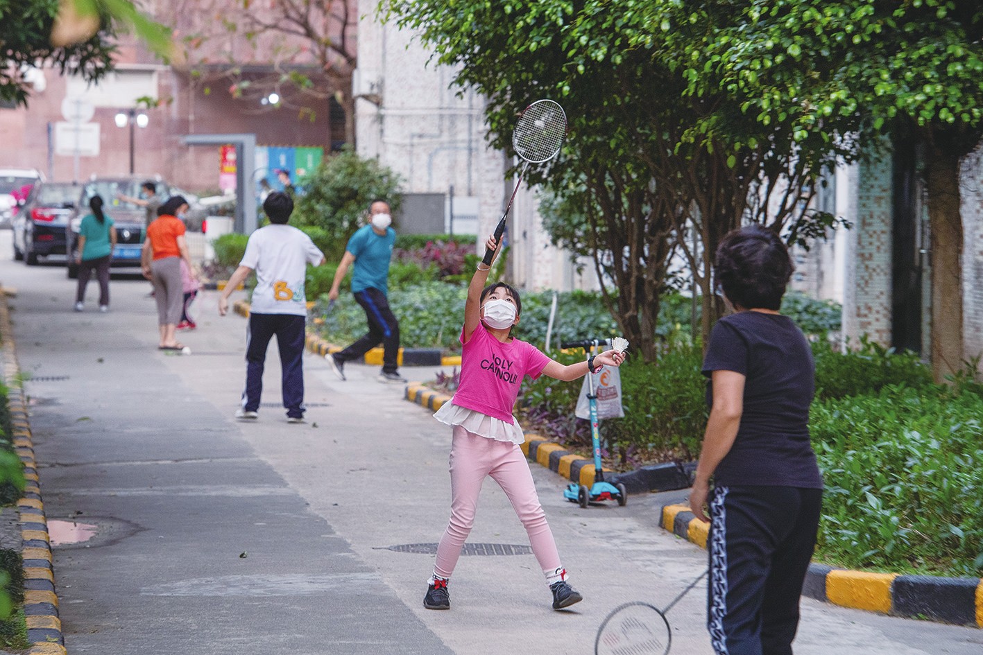 自3月14日起,深圳全市社区小区、城中村、产业园区实行封闭式管理。目前,封闭区域居民积极配合社区出入管理,做好测温、核酸检测等工作,生活稳定有序。图为深圳市福田区明月花园小区的居民在楼下健身。