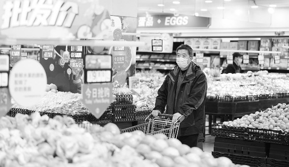 在抗击疫情的同时,江苏省南京市多措并举,做好民生保障工作,确保全市“菜篮子”“米袋子”供应充足、价格平稳。图为市民在江宁区一家超市购物。