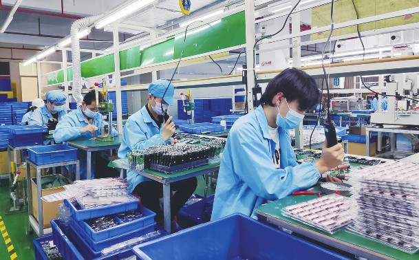 抗疫情、保生产,物流畅通至关重要。地处福建省泉州市南安市霞美镇的福建宝锋电子有限公司是一家专门从事无线对讲机生产、销售的企业。在公司门口,一辆辆装满了对讲机的货车正在排队出厂。不久后,这些产品将经由深圳港发往全球各地。“‘泉通行’解了我们的燃眉之急!”福建宝锋电子有限公司总经理王少峰说,得益于泉州市近期推出的“泉通行”电子通行码服务,公司进出货不畅的难题得到大大缓解,企业当前的生产运转基本稳定。图为福建宝锋电子有限公司的工作人员在对讲机生产流水线上操作。