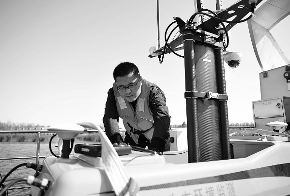 雄安新区生态环境局采用无人船采样,将水质数据通过5G信号回传,船上的水质监测设备能够实现快速分析,助力白洋淀区水质改善。图为工作人员在雄安新区白洋淀调试无人船。