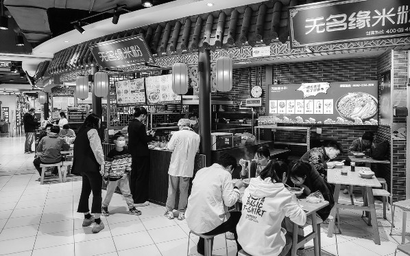 经济南市委统筹疫情防控和经济运行工作领导小组(指挥部)综合研判决定,除历城区、济南高新区重点管控区域及全市其他封控区、管控区以外的区域,自5月10日零时起,有序恢复餐饮(堂食)经营活动。受新冠肺炎疫情影响,济南市的餐饮堂食3月30日按下“暂停键”。长达40天时间里,餐饮门店只接受外卖订单,顾客无法进店就餐。图为顾客在济南一家商场的餐饮区用餐。