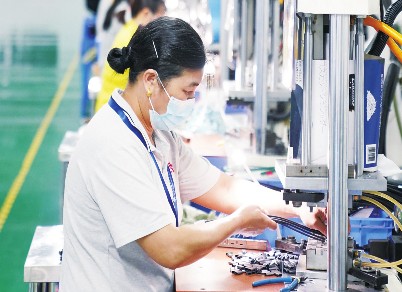 近日,江西各地企业陆续复工复产。江西省全南县电子信息产业集群在做好疫情防控的同时,稳步加快生产进度,保质保量完成相应订单。图为江西省全南县一家科技有限公司的员工在线束成型车间工作。