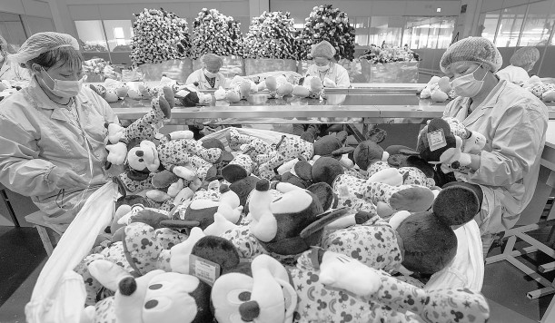 近年来,江苏省扬州市邗江区坚持“小玩具做成大产业、小玩具链接大市场、小玩具促进大发展、小玩具作出大贡献”的发展定位,建设毛绒玩具特色小镇,目前全区共有生产类毛绒玩具礼品注册企业300余家,知名卡通形象授权200余个。图为在扬州市邗江区雅伦玩具有限公司,工人在生产车间加工毛绒玩具。