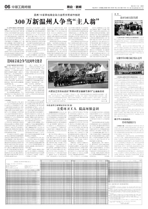 温州市工商联负责人介绍,创建全国文明城市,建设“千年商港,幸福温州”,是温州市委、市政府的重大决策部署,是增强温州城市魅力、提高温州城市品位、塑造温州城市形象的系统工程,是温州优化营商环境、推动高质量发展的重要举措。为进一步发挥企业示范带头作用,在全社会营造“文明城市人人创,城市文明人人享”的良好氛围,温州市工商联日前专门发出倡议,得到广大民营企业及商会的积极响应,温州异地商会就是一个典型。目前温州在民政局登记注册的有46个异地商会,其中省级和副省级19个,地市级24个,县级3个。他们在围绕党委、政府中心工作上,总是积极响应,率先示范,很好地发挥了商会组织作用,值得点赞。