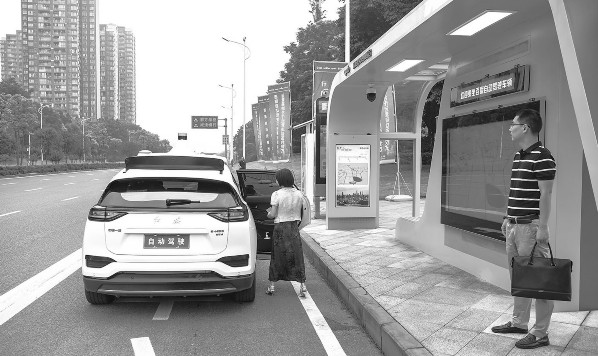 近日,百度Apollo自动驾驶出行服务在重庆市永川区正式投入商业化运营。图为在重庆永川城区,乘客乘坐百度Apollo自动驾驶出行服务车。