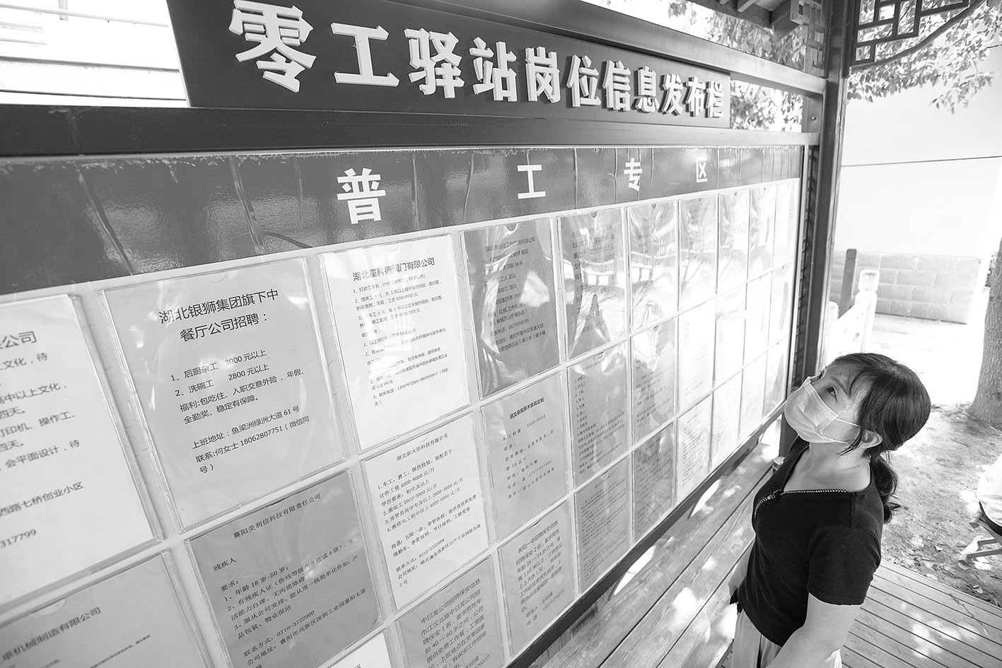 湖北省加快建设“零工驿站”,为快递员、网约送餐员等灵活就业人员提供一个冬暖夏凉的驻足地。同时,“零工驿站”长期张贴企业招工需求,方便灵活就业人员对接招工信息。目前,湖北全省已建成“零工驿站”190家,大多设在乡、镇、社区一级,日均登记求职超过6000人(次),日均提供就业信息1.3万余条。图为务工人员在湖北省襄阳市云湾社区“零工驿站”查看招聘信息。
