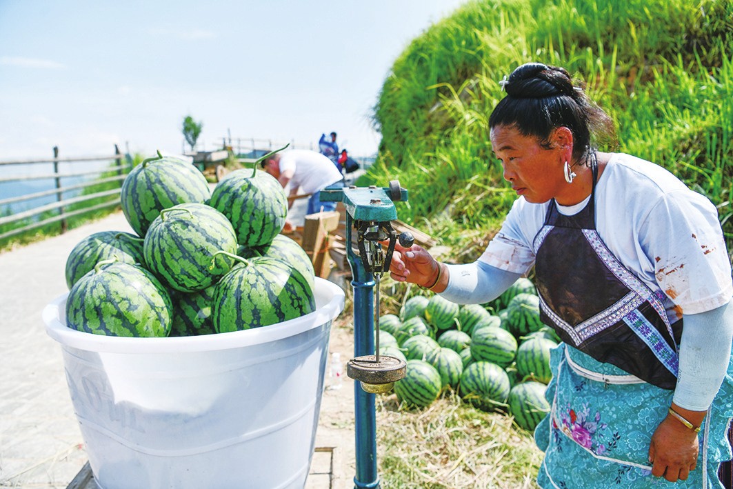 近年来,贵州省黔东南苗族侗族自治州榕江县根据地理和气候条件进行农业产业结构调整,引进西瓜新品种,以“党支部+合作社+农户”的模式,引导农民利用山地、林带、梯田、大棚等进行优质西瓜种植。同时,广东省佛山市南海区“东西部协作”对口帮扶榕江县,在西瓜销售和文化旅游上给予更多帮助,带动山区农产品出山,促进农民增收,赋能乡村经济振兴。图为榕江县忠诚镇苗本村的农民称量西瓜,准备销往深圳。(杨文斌)
