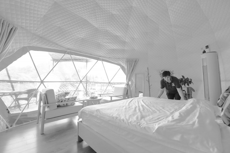 近年来,位于燕山腹地的河北省兴隆县依托毗邻京津的区位优势和丰富的山水资源,打造一批特色鲜明的主题精品民宿,吸引当地村民在家门口就业,拓宽村民增收渠道,为乡村振兴注入新活力。图为7月21日,在兴隆县雾灵山镇一家民宿,工作人员周桂君在整理房间。