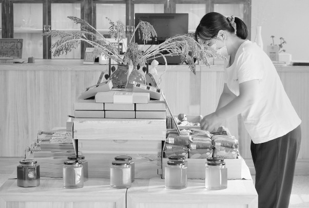 位于河南省焦作市修武县西村乡的大南坡村,曾因煤炭资源而兴,经过多年开采,村庄逐渐面临资源枯竭和环境破坏的发展瓶颈。近年来,当地对村庄里的美学资源进行活化利用,在改善村民生活环境的同时,将原本破败的老建筑改造成书店、茶社、展馆、民宿,吸引游客前来打卡游览。村里断演40余年的戏曲剧团也重新开唱,还邀来表演团队开展文艺演出,豫北山村逐渐焕发新生。图为工作人员在大南坡村的商店内整理货品。