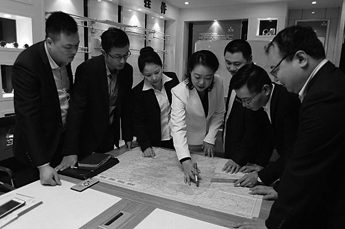 (图)朱英姿(中)在与团队共商企业发展蓝图