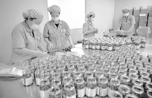 近年来,地处秦巴山区的陕西省安康市汉阴县充分运用自然资源,大力发展富硒和绿色食品、文化旅游、新型环保建材等绿色产业,不断优化产业结构,推动县域经济发展,取得良好成效。2012年至2021年间,汉阴县年生产总值(GDP)年均增长8.8%;陕西省县域经济监测排名由2011年第65位上升至2021年第34位。图为陕西省汉阴县一家食品加工企业的工人在包装玫瑰花茶。