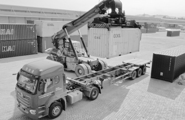 福州海关近日公布的统计数据显示,今年前7个月,福建省外贸进出口额1.15万亿元人民币,比去年同期增长11.4%。图为福建泉州晋江国际陆地港区工作人员在吊装准备运往厦门港装船出口的集装箱。